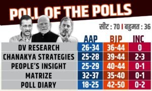 Delhi Election Poll of Polls BJP AAP Congress: PEOPLE’s INSIGHT, JVC, Chanakya Strategies, MATRIZE, Poll Diary, P MARQ, People’s Pulse, DV Research, WeePreside, Mind Brink ने नतीजों को लेकर अपने अनुमान जारी किए हैं। इसमें दो सर्वे को छोड़कर बाकी में बीजेपी की सरकार बनने का अनुमान है।